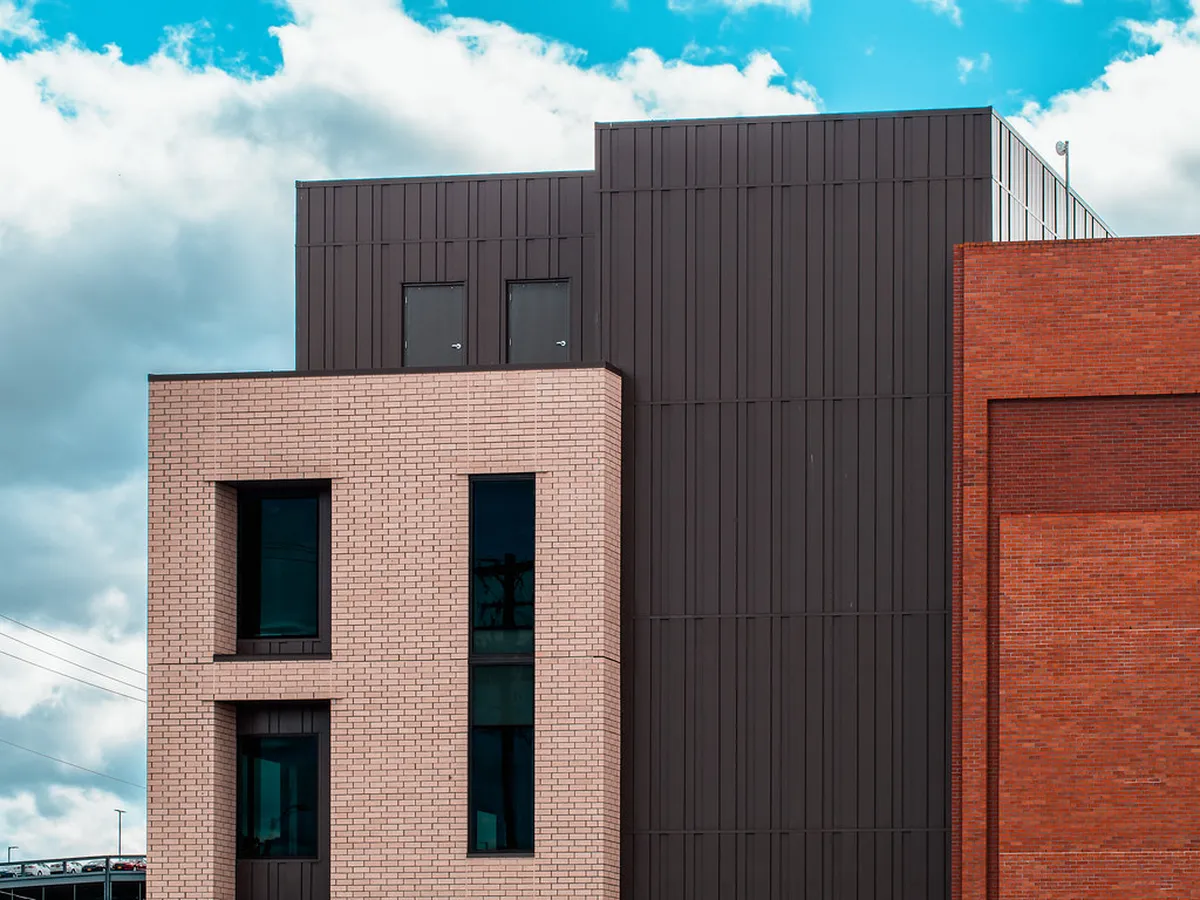 The design features a large glass entrance that faces the main road. It looks very modern compared to the older brick buildings nearby. You can see the reflection of the sky on the glass.